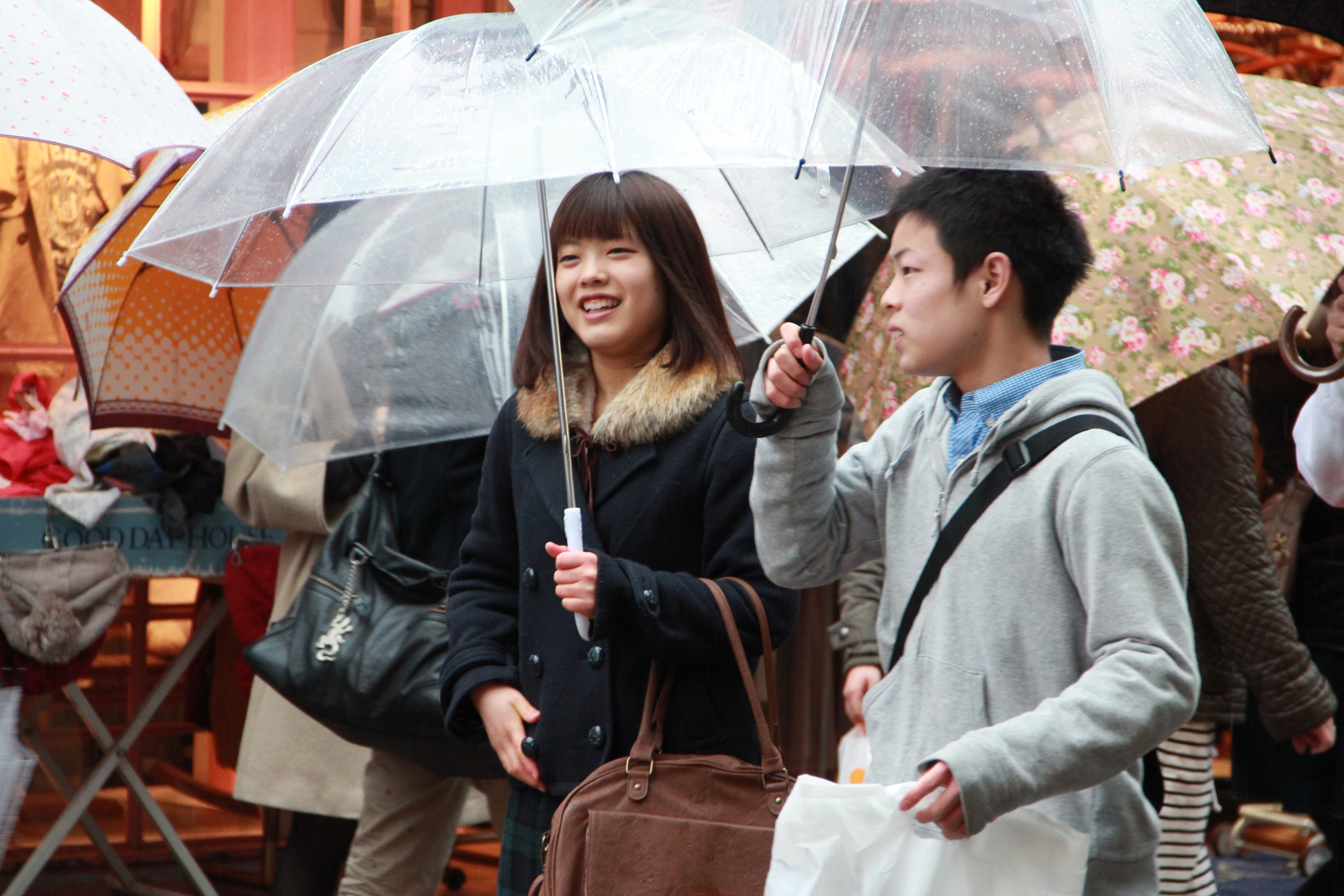Despite the weather today and yesterday, Harajuku was busy as ever. All the shops were open, with clothes and items on display and adorable girls calling out deals to passer-bys. It can be quite the tourist destination, but it also attracts plenty of locals as well. In other words: it’s crowded. I find that it’s easier to avoid using an umbrella all together, as maneuvering with one between all those people and their umbrellas is virtually impossible. Not to mention, it was absolutely freezing. The weather report said 10 degrees Celsius but it felt more like 7 degrees. I’m going to need a better coat.